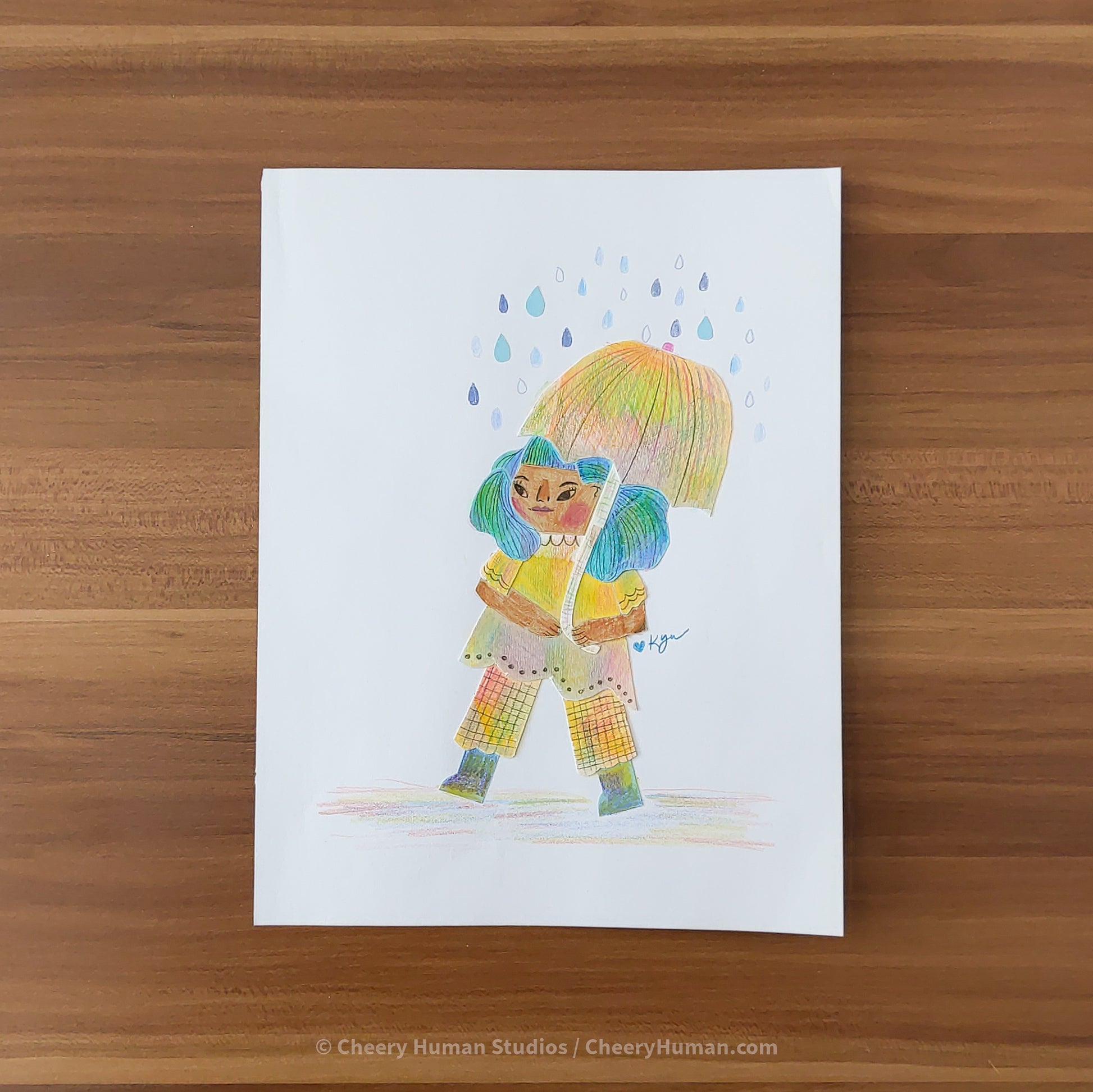 *PAPER ART ORIGINAL* Walking in the Rain - Original Paper Cut Artwork ✺ Watercolor - Acryla Gouache - Colored Pencil Art