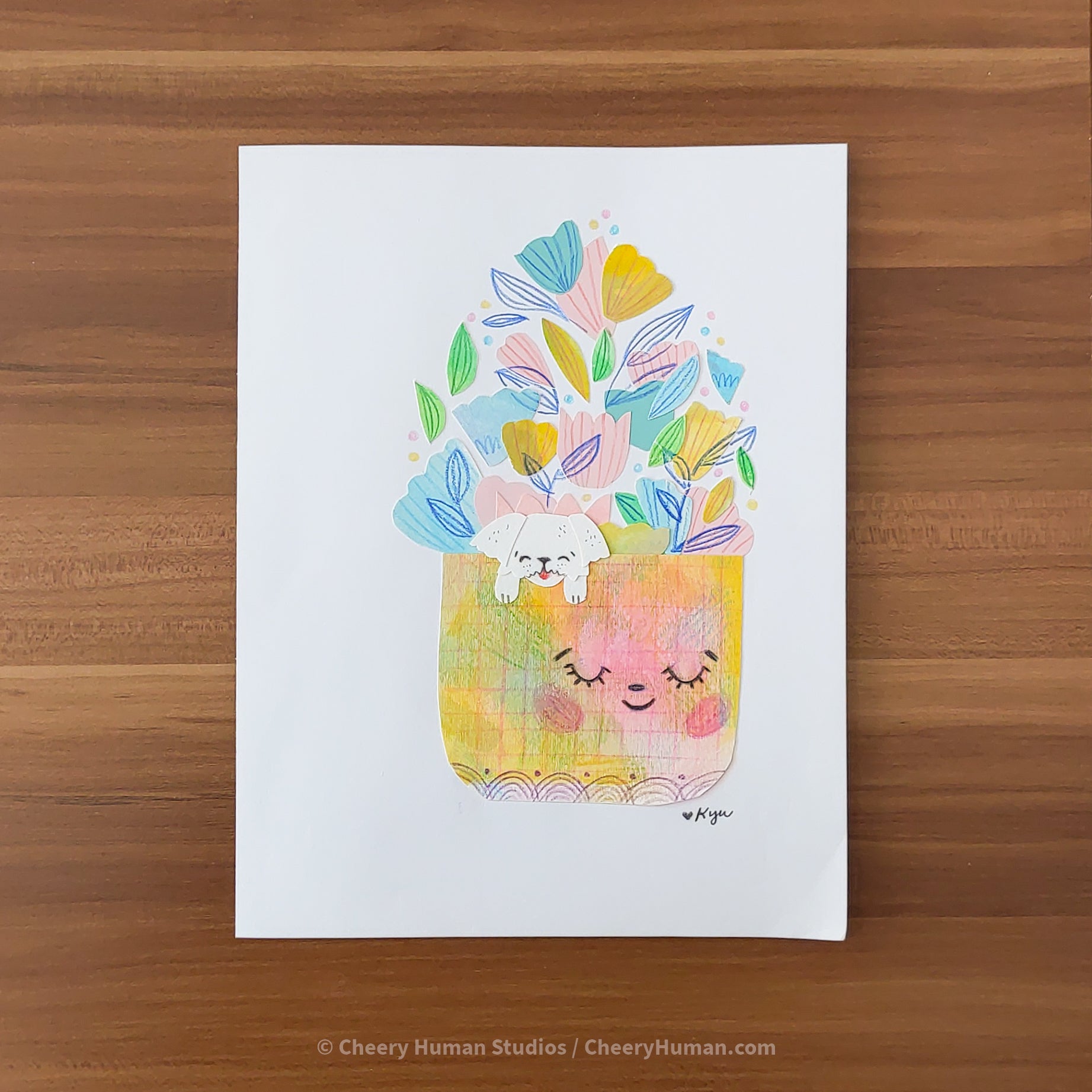 *PAPER ART ORIGINAL* Cheery Dog + Flowers - Original Paper Cut Artwork ✺ Watercolor - Acryla Gouache - Colored Pencil Art