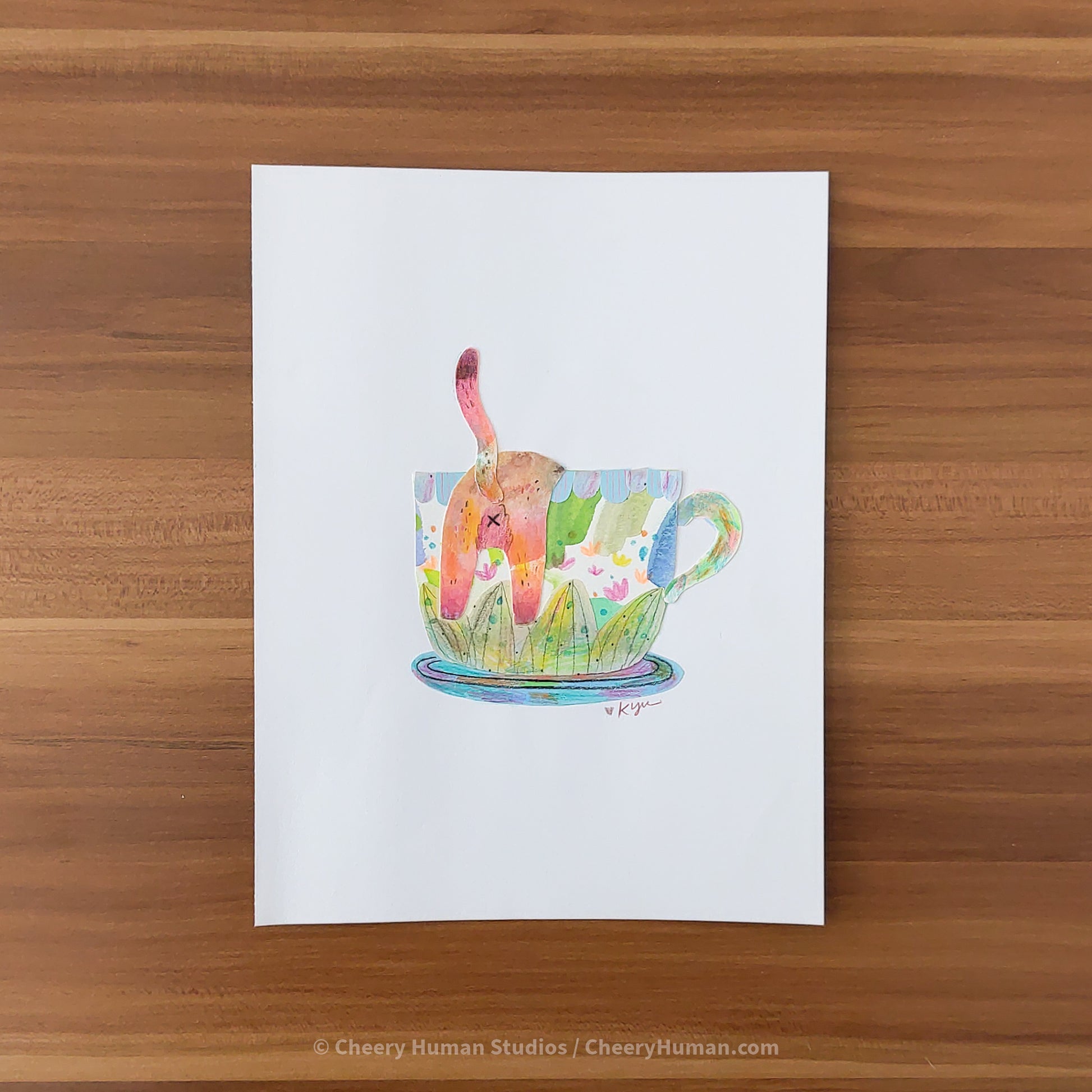 *PAPER ART ORIGINAL* Cat Butt + Teacup - Original Paper Cut Artwork ✺ Watercolor - Acryla Gouache - Colored Pencil Art
