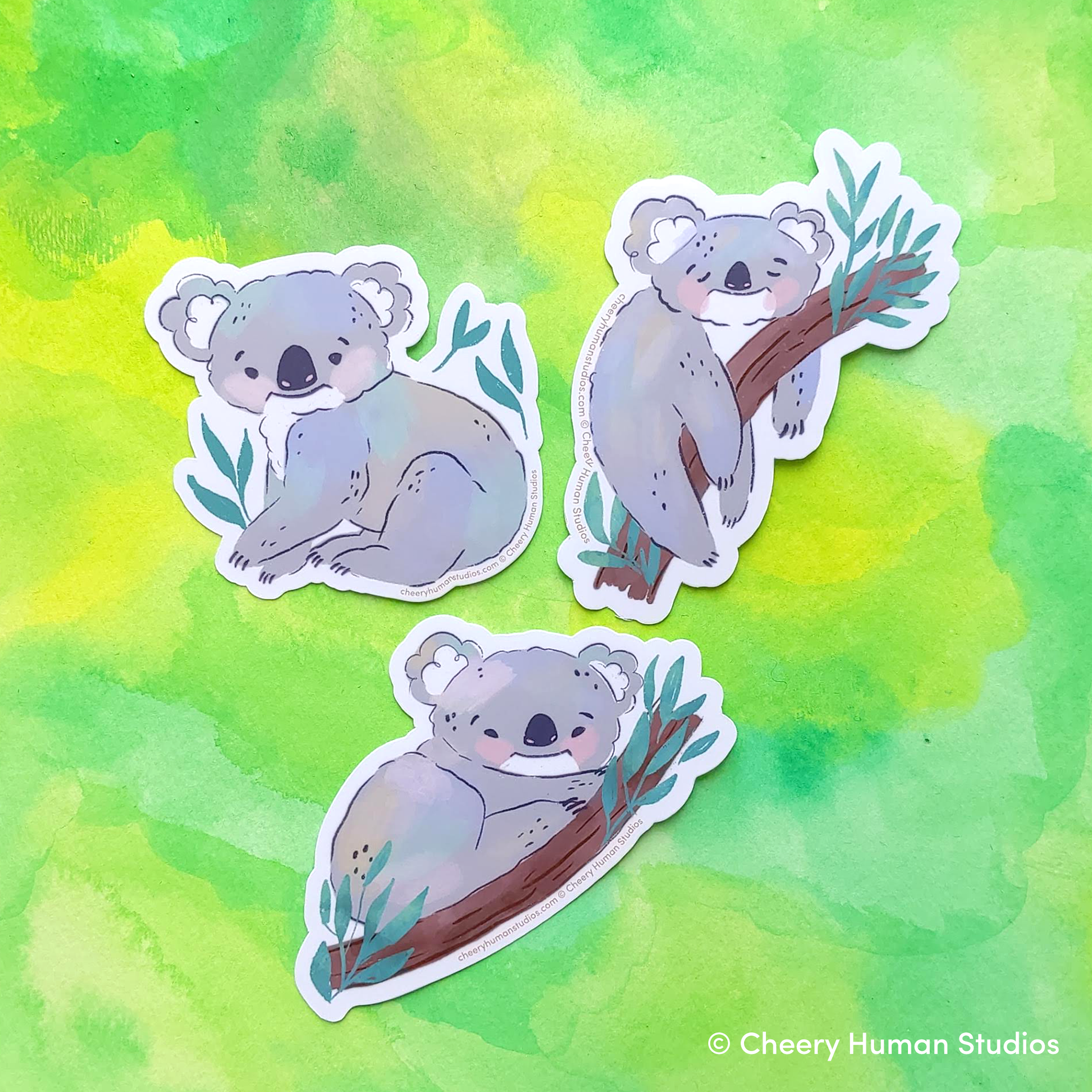 Set includes 3 vinyl stickers. One of each Koala design: