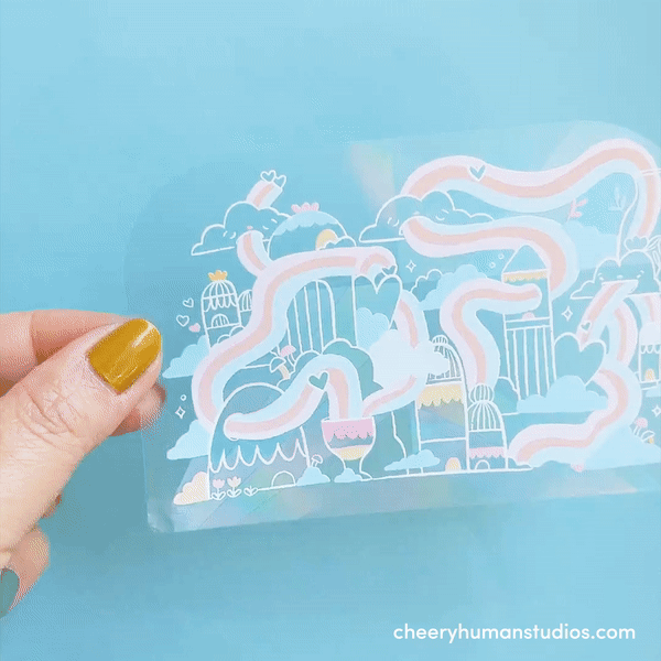 - Illustration professionally printed on radial axicom pattern film to create unique rainbow effects