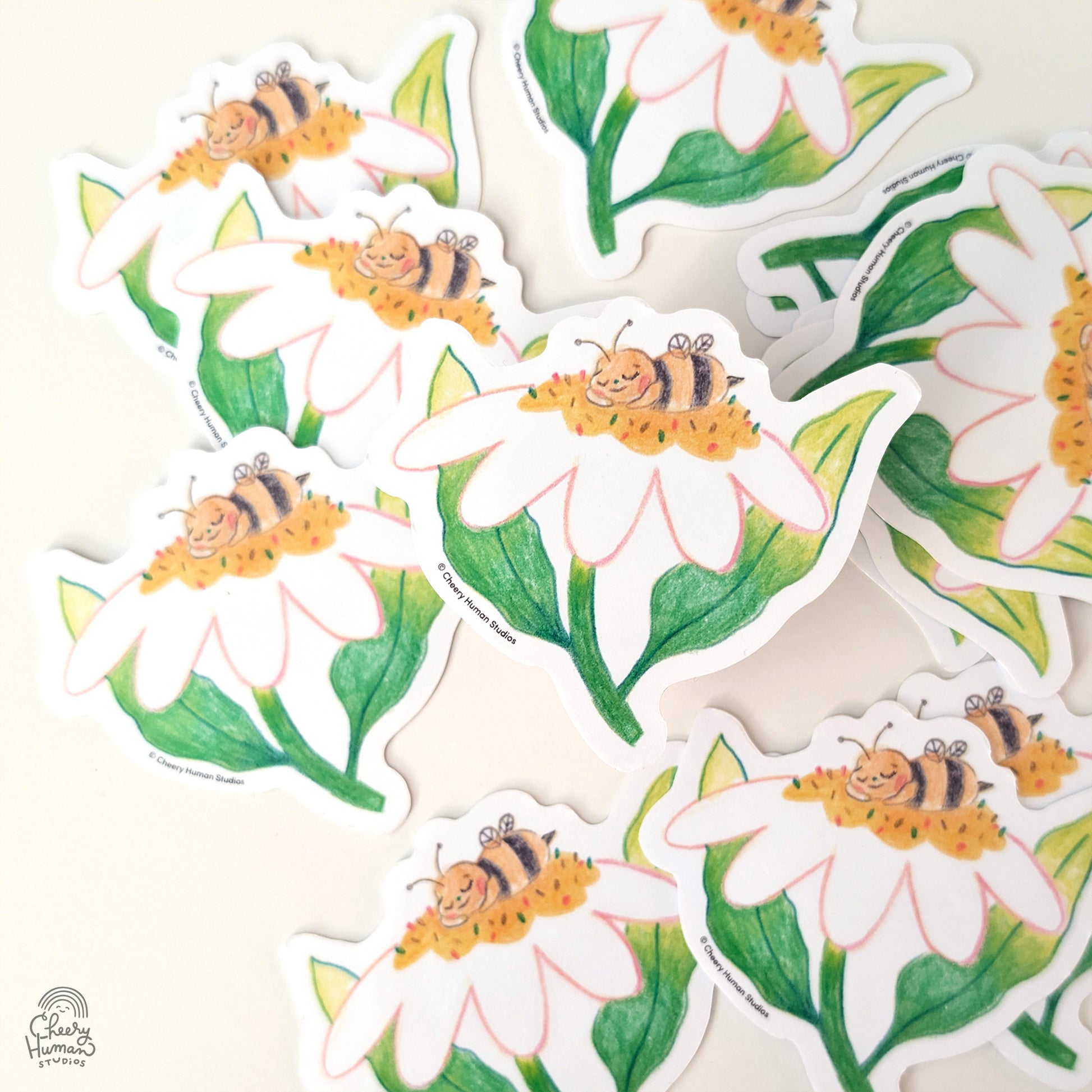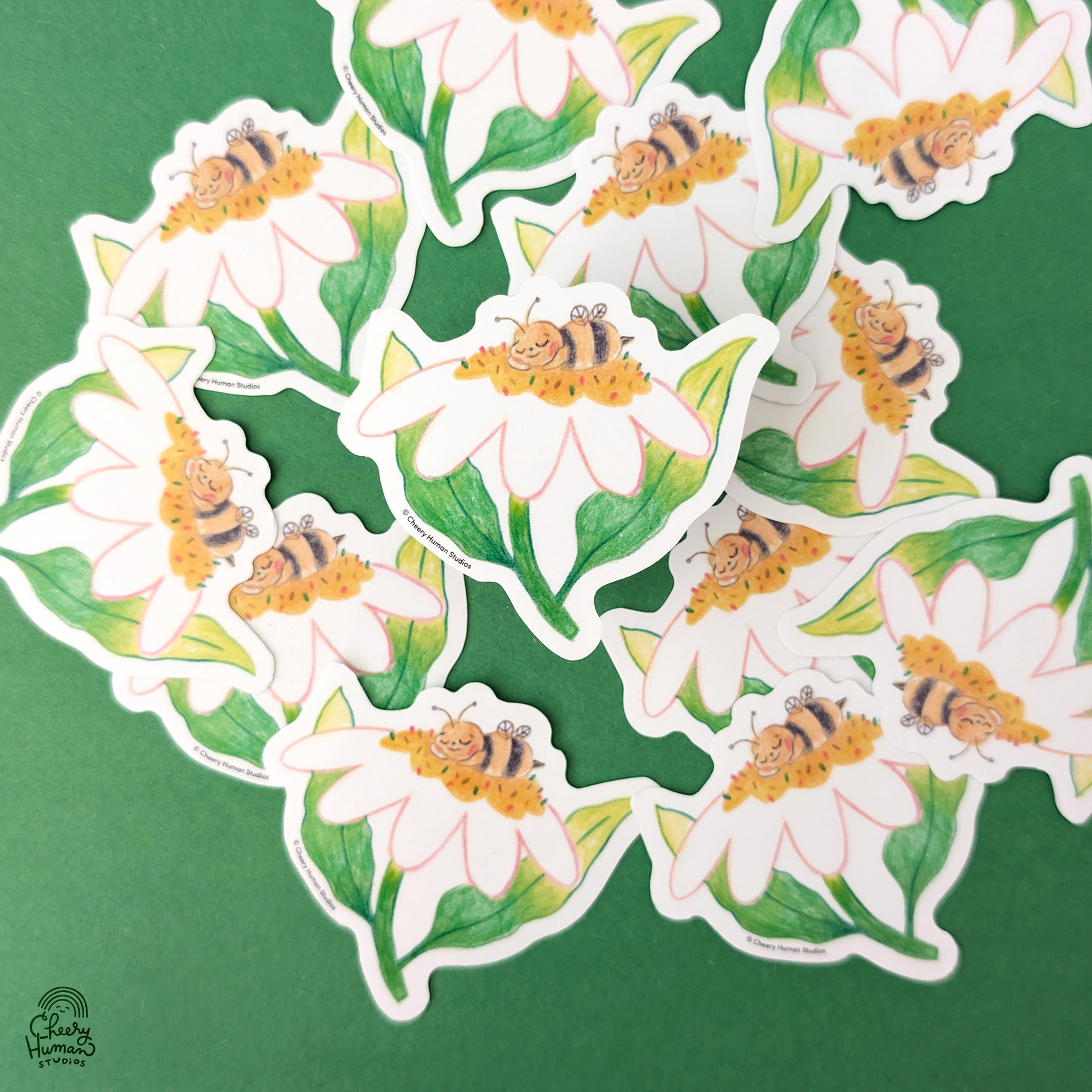 Get buzzing with our "Sleepy Bee" handcrafted vinyl sticker! This adorable design adds a playful touch to any surface.