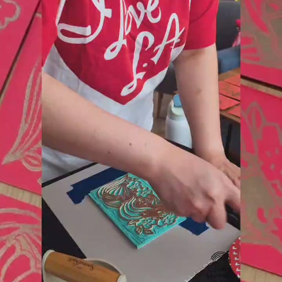 In this process, I carefully carved my hand-drawn design into a rubber block and printed every envelope by hand using gold relief ink. The overall production process took a little over a week which included concept, illustration, design carving, test printing, iterating, final printing, drying time, and packaging design.